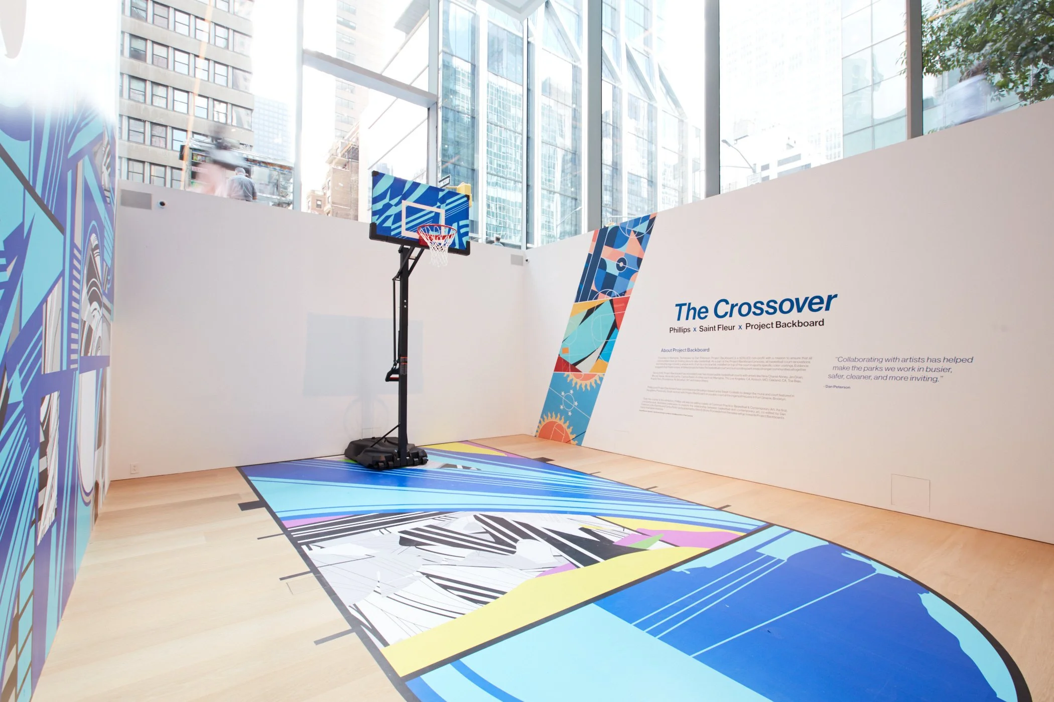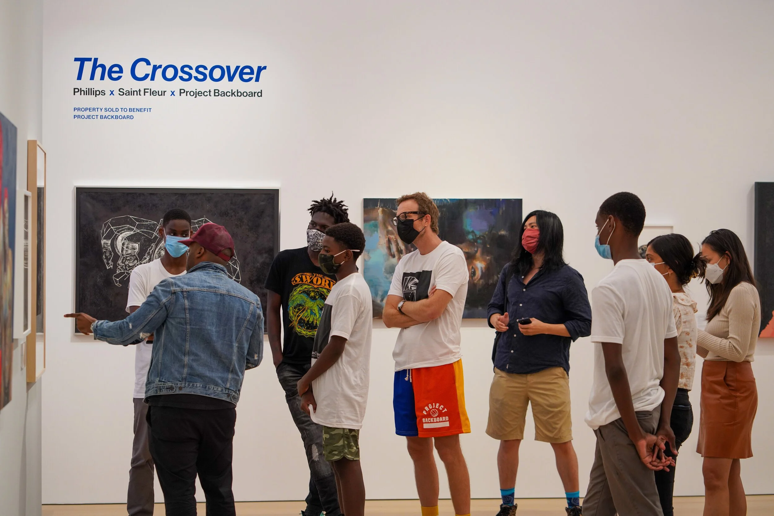 Phillips Auction House tapped Gardy St. Fleur to organize a sale-within-a-sale of the “The New Now” auction in 2021 titled “The Crossover” (gallery exhibition installation, middle photograph). Gardy (red hat) leading tour at the exhibition (photo below) It was comprised of 13 new works by emerging Black artists. “The Crossover” brought in just over $311,000, all of which was put toward initiatives in Haiti and New York run by Project Backboard, a Memphis-based nonprofit that rehabilitates public basketball courts and commissions artists (photograph above) to make work for these sites.